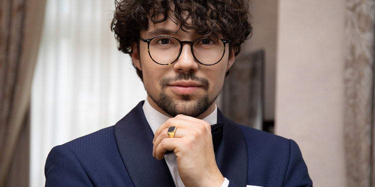 Eleganter Mann mit lockigen Haaren und Brille in dunkelblauem Anzug trägt goldenen Siegelring