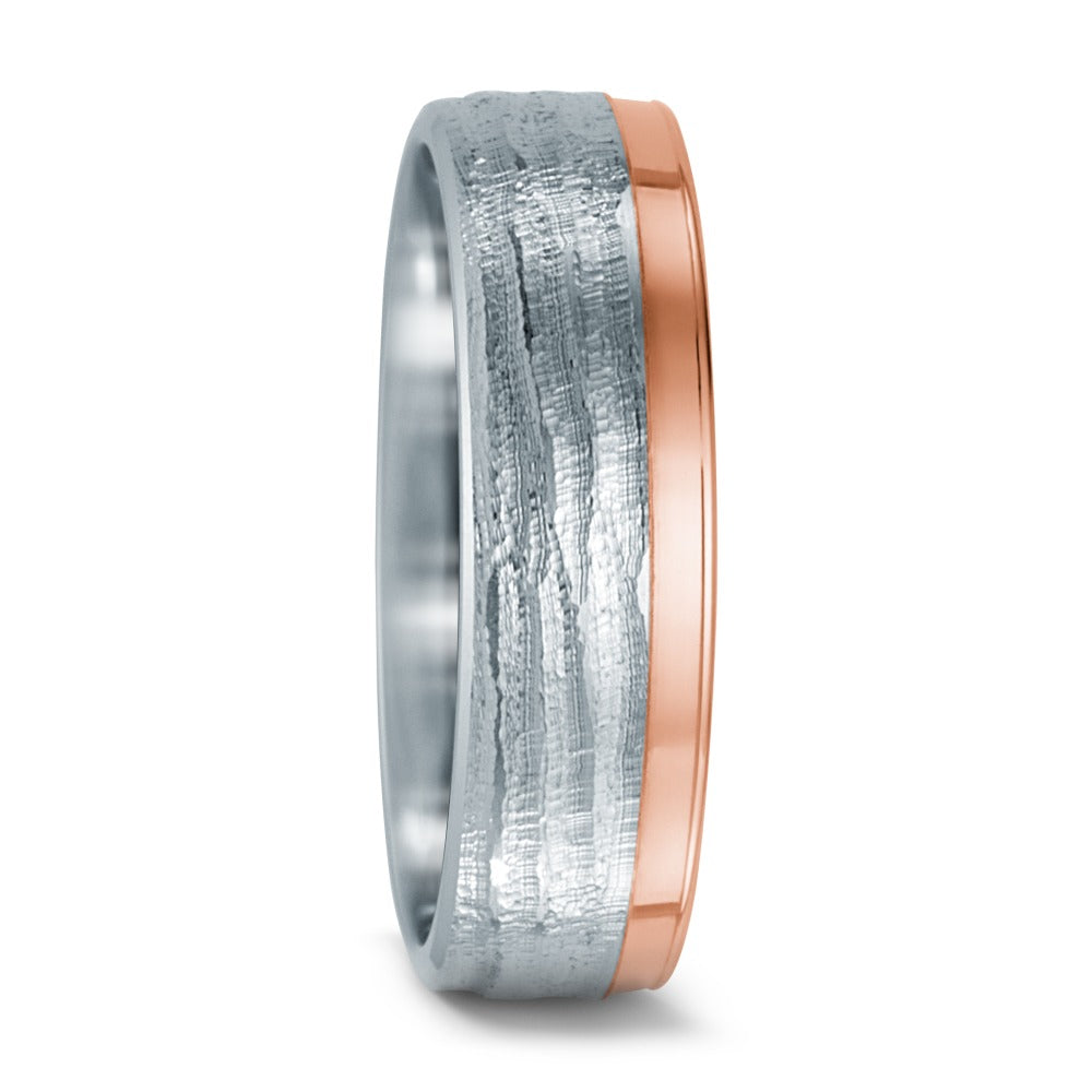 Alliance pour couple en acier inoxydable avec une élégante bande en or rose 585. Design moderne mêlant la robustesse de l'acier et la chaleur de l'or, parfaite pour symboliser un lien unique et durable. Un choix raffiné et contemporain pour célébrer votre union.