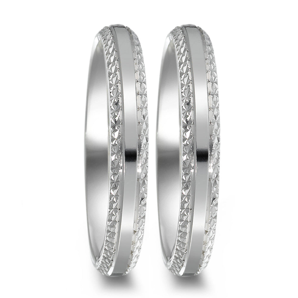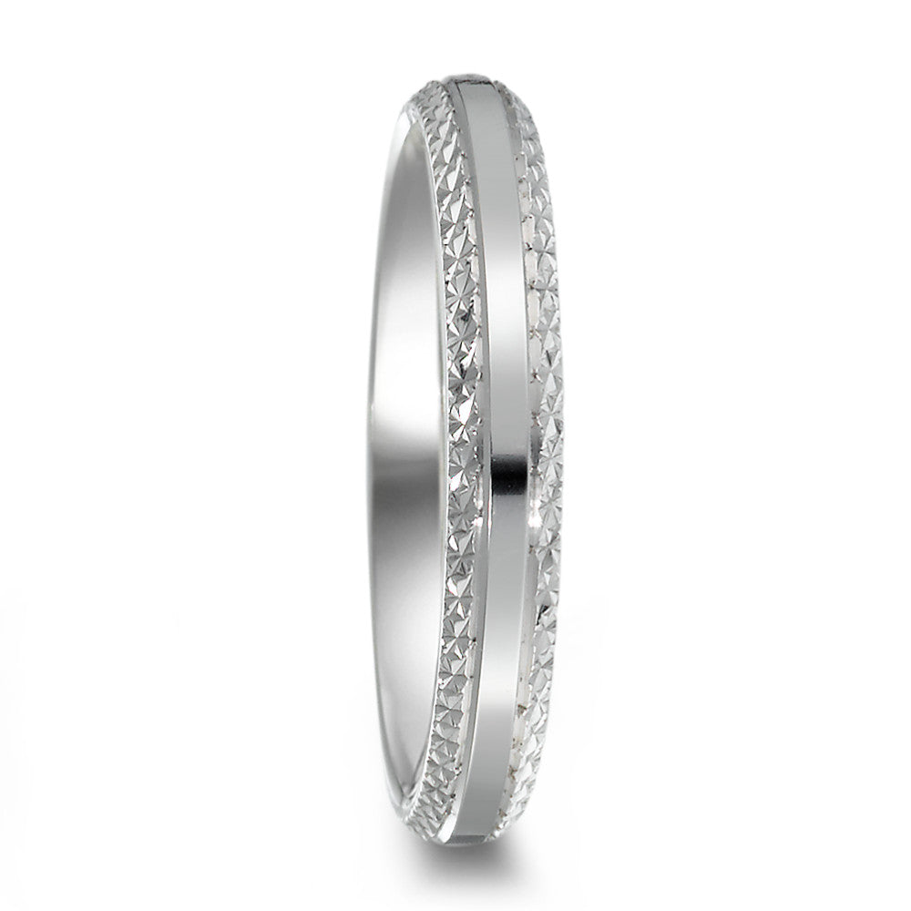 Bague en or blanc 375, au design élégant et raffiné. Cette bague fine présente une surface centrale lisse bordée de motifs facettés scintillants qui captent la lumière sous tous les angles. Un bijou intemporel et discret, idéal pour un usage quotidien ou une occasion spéciale.
