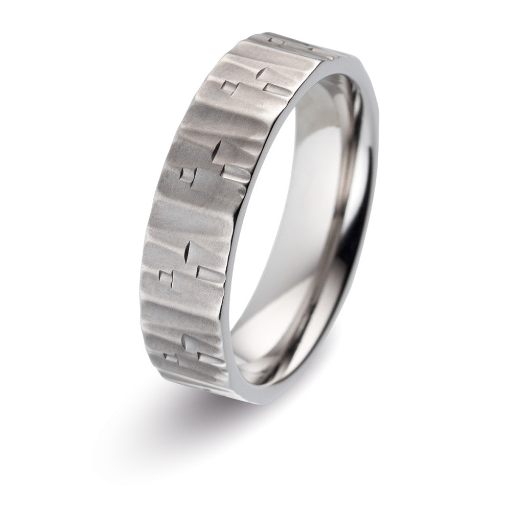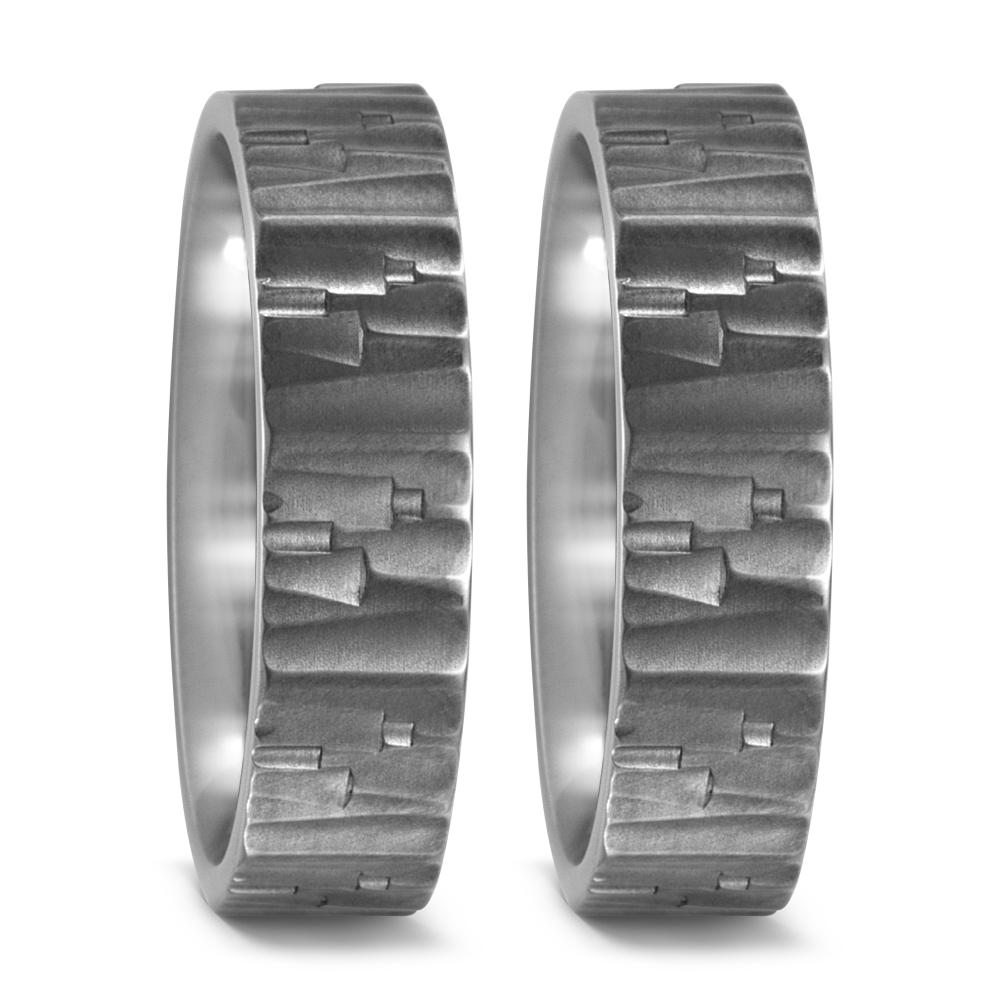 Bague de couple en titane, alliant robustesse et élégance. Son design texturé unique offre un style moderne et masculin. Légère et résistante, cette bague est idéale pour symboliser un engagement durable avec sobriété et raffinement.