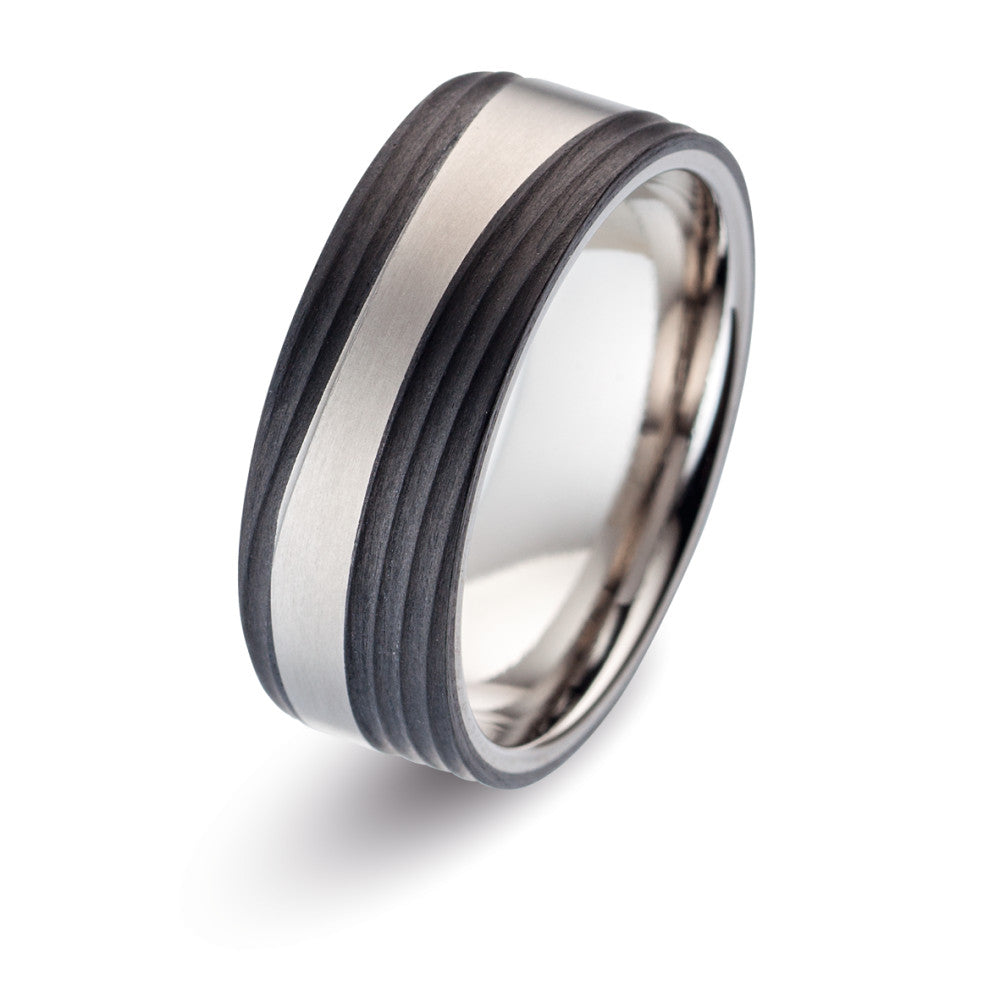 Alliance élégante en titane et carbone, alliant robustesse et légèreté. Son design moderne avec un effet bicolore crée un contraste saisissant, parfait pour un engagement symbolique ou une déclaration de style unique. Confortable et durable, idéale pour un port quotidien.