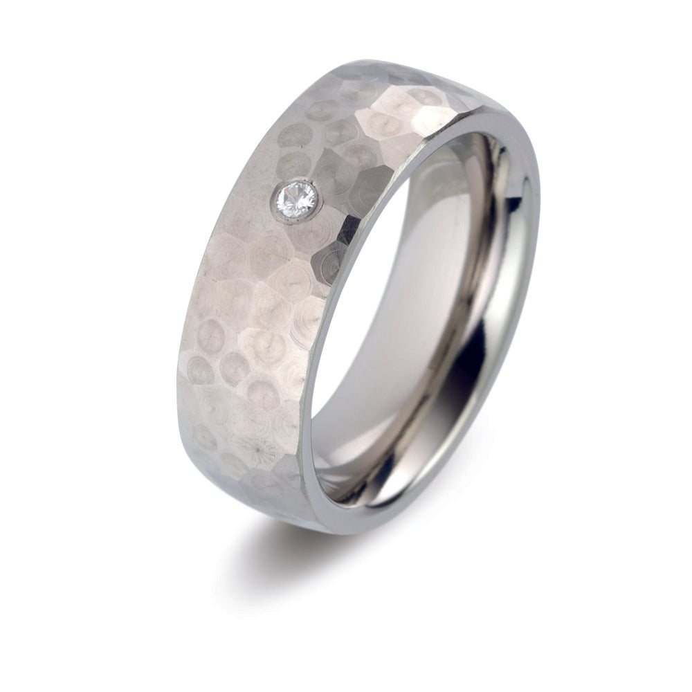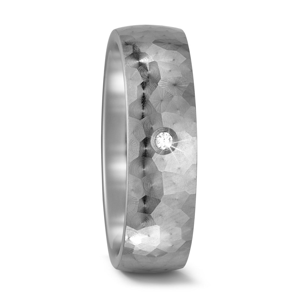 Bague de femme en titane avec un diamant étincelant. Design élégant et moderne avec une finition martelée distinctive. Parfait comme alliance ou bague de couple, alliant durabilité et raffinement. Un symbole d’amour durable et d’élégance intemporelle.