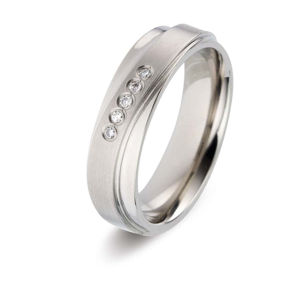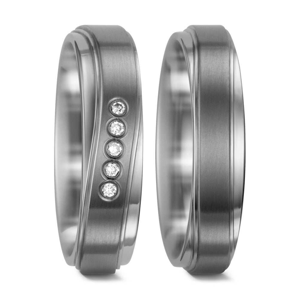 Bague de partenaire pour femme en titane, élégante et résistante. Son design moderne est sublimé par cinq diamants étincelants, offrant un équilibre parfait entre sophistication et durabilité. Un symbole précieux pour une union durable et pleine d'éclat.