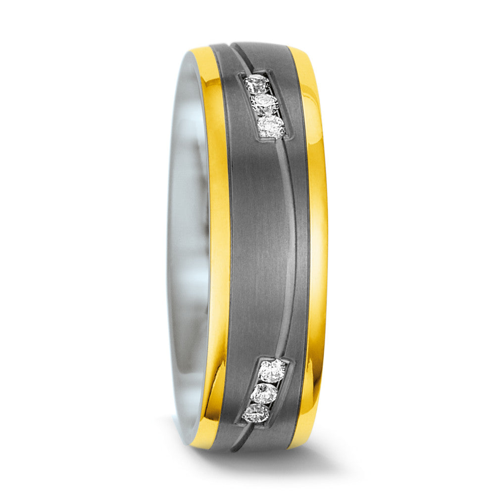 Bague de partenaire pour femme en titane avec bordures en or jaune 585. Elle est ornée de six diamants étincelants, offrant un équilibre parfait entre robustesse et élégance. Un symbole raffiné et moderne pour célébrer votre engagement.