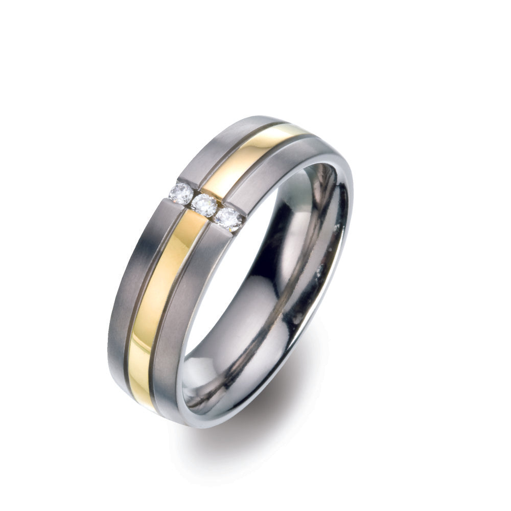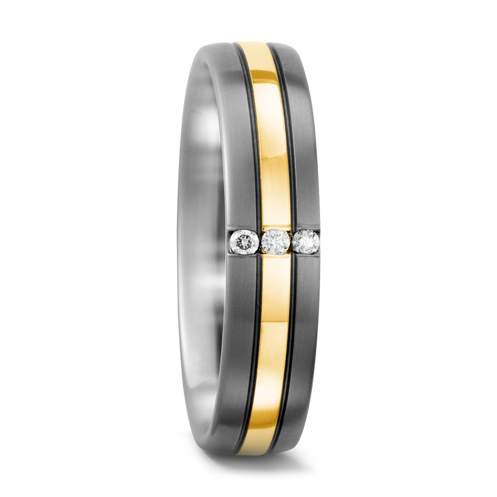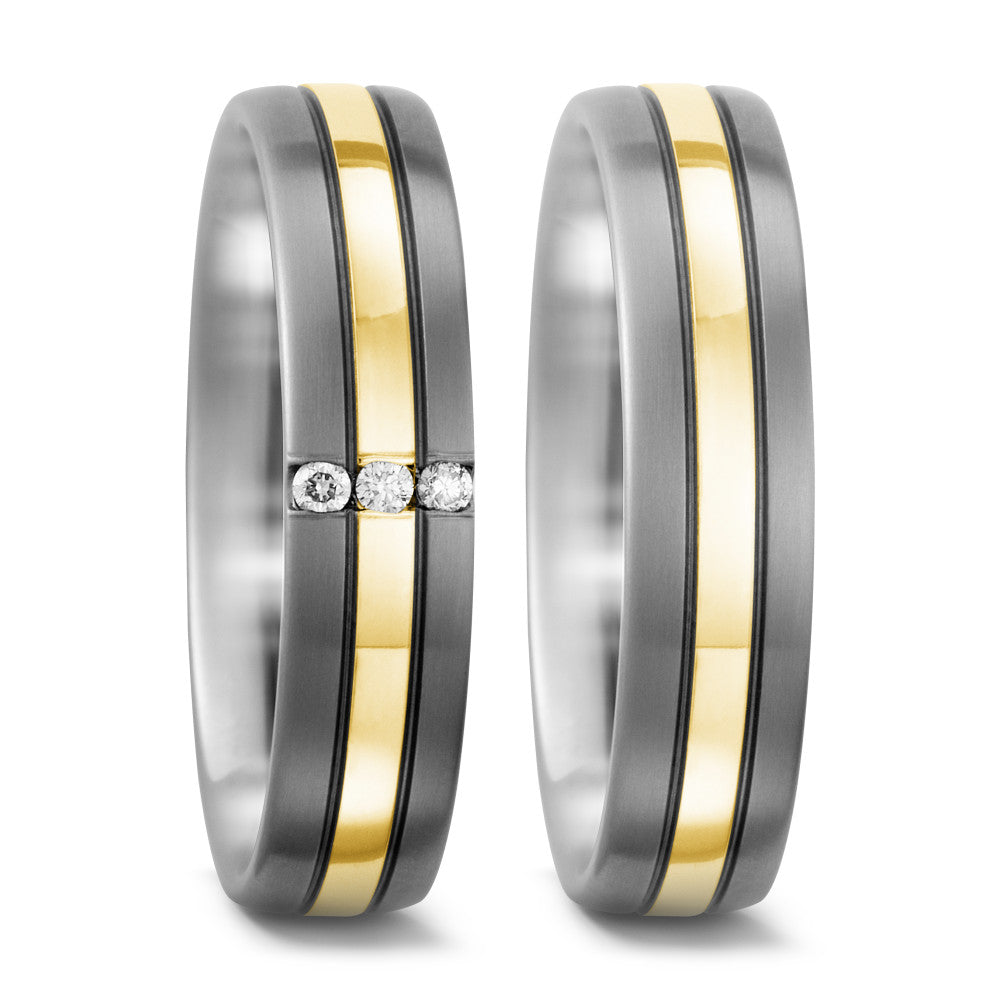 Bague pour femme en titane mat avec un insert en or jaune 750, ornée de trois diamants scintillants. Ce design moderne et élégant symbolise l'union parfaite, alliant robustesse du titane et luxe raffiné de l'or et des pierres précieuses. Parfait pour un engagement ou un partenariat durable.