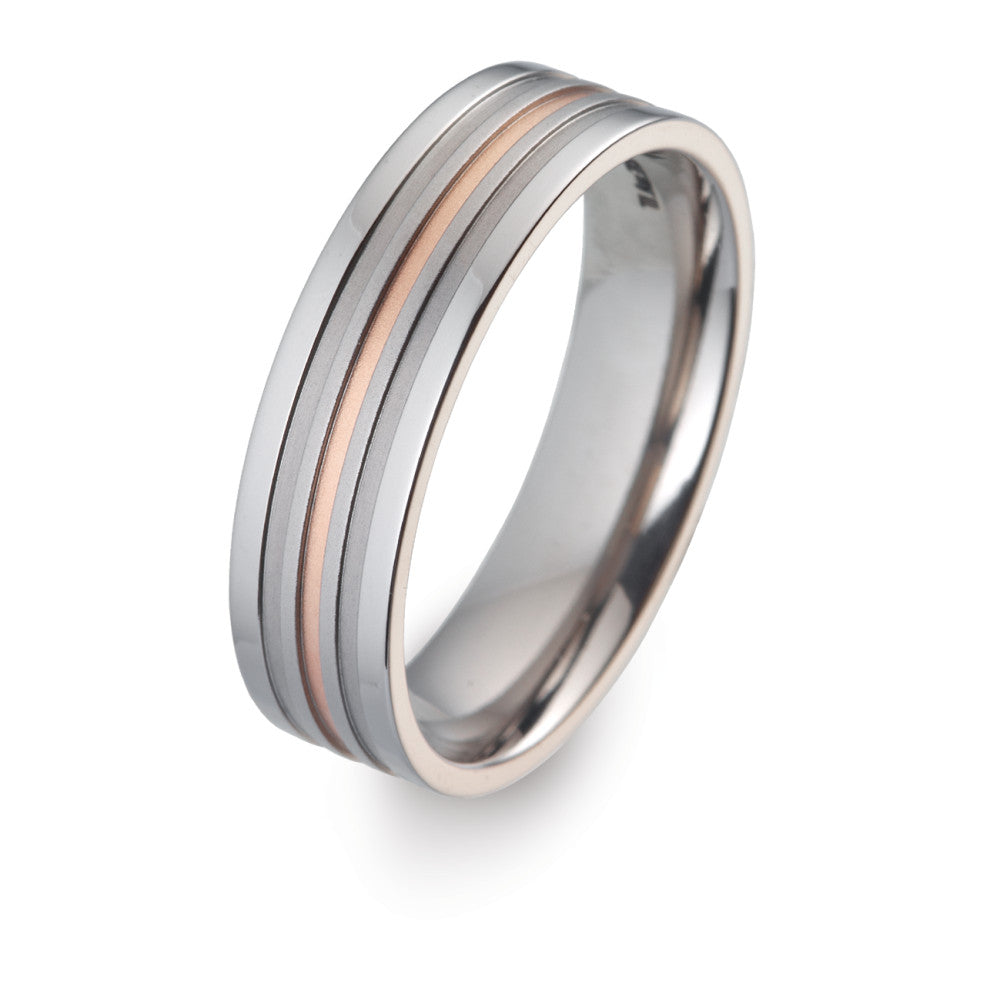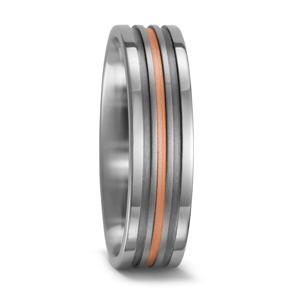 Alliance pour couple en titane, élégamment rehaussée d'une fine ligne en or rouge 750. Ce design moderne et raffiné allie robustesse et chaleur, symbolisant l'engagement durable. Un choix parfait pour célébrer l'amour avec style et distinction.