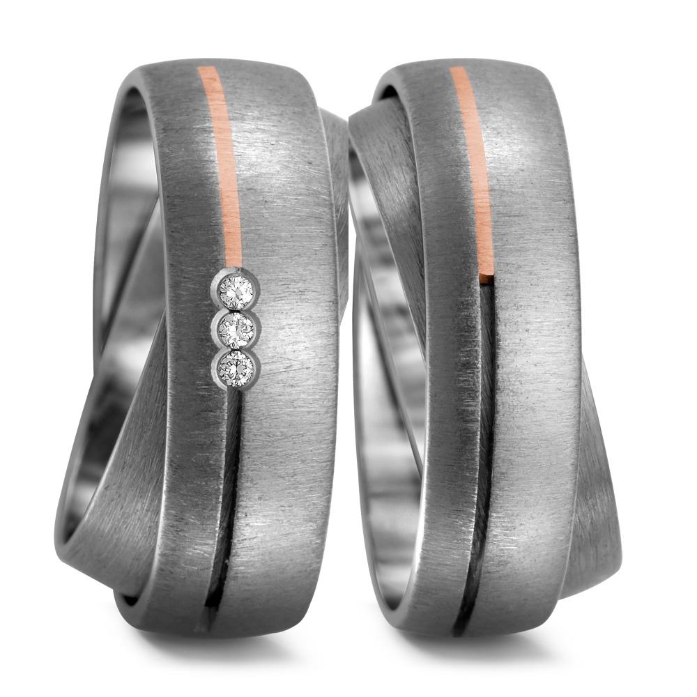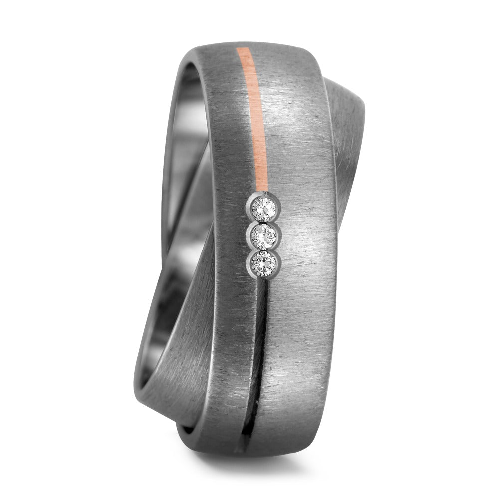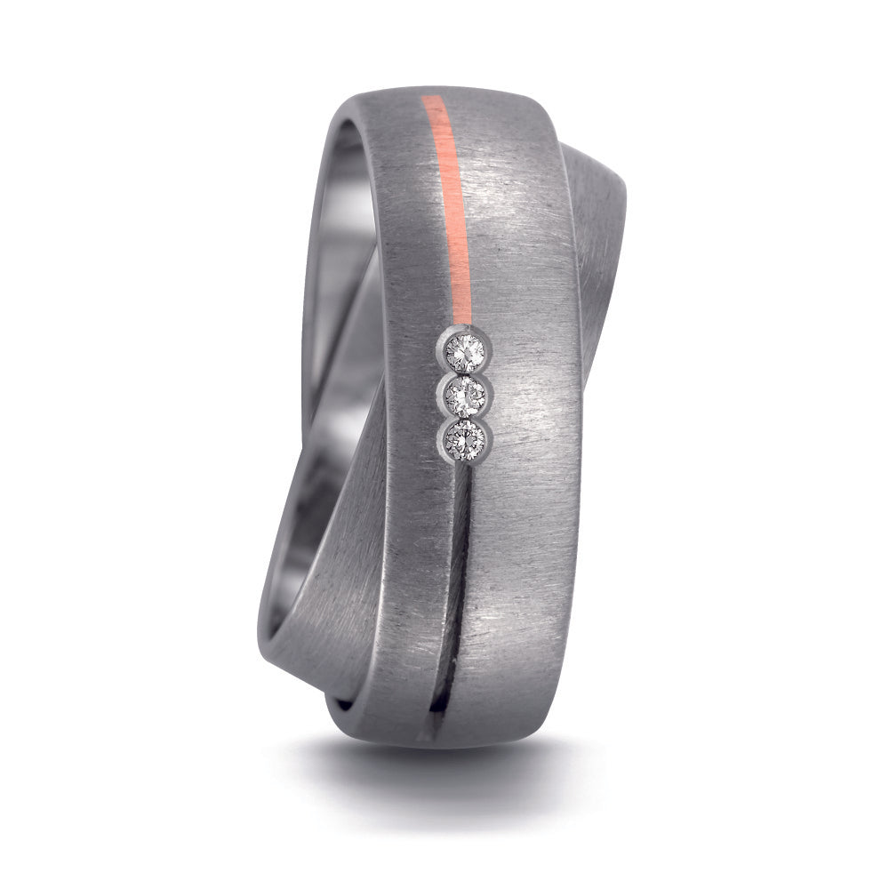Bague partenaire pour femme en titane, élégamment ornée d’une bande en or rose 750. Trois diamants scintillants ajoutent une touche de lumière à ce design moderne et chic. Un symbole parfait d’engagement et d’amour durable, alliant robustesse et raffinement.
