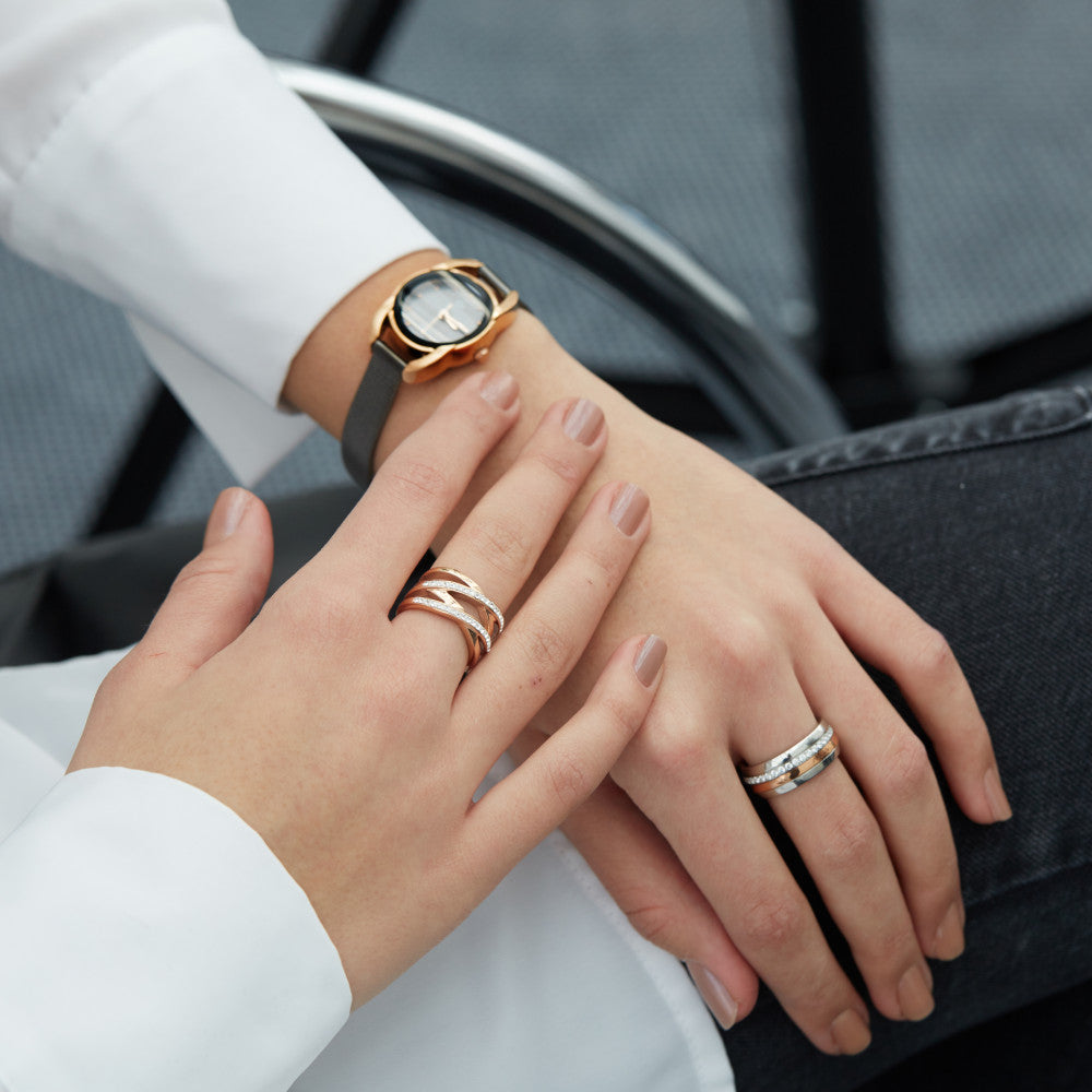 Bague pour femmes en acier inoxydable rose doré, ornée de cristaux étincelants. Son design entrelacé apporte une touche moderne et élégante, parfaite pour sublimer toutes vos tenues avec finesse et brillance. Un accessoire chic et durable au quotidien.