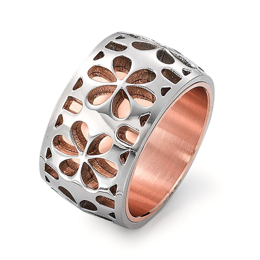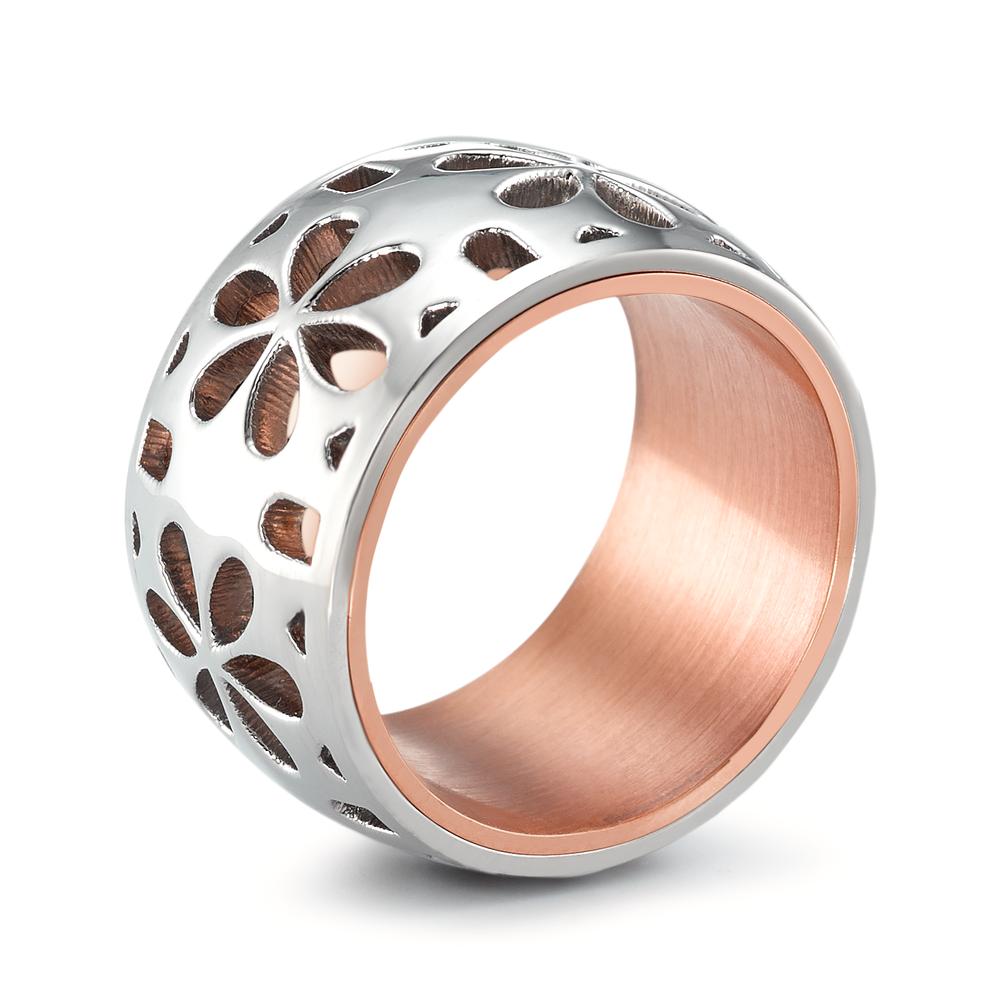 Bague pour femme en acier inoxydable avec motif floral découpé. Design large et élégant, intérieur cuivré pour un contraste moderne. Un accessoire tendance et durable, idéal pour sublimer toutes vos tenues avec une touche florale raffinée.