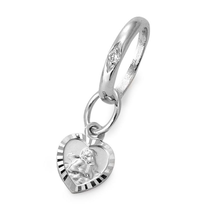 Joli pendentif de baptême pour bébé en or blanc 750, orné d'un diamant délicat. Ce charm en forme de cœur avec un ange protecteur symbolise la protection et l'amour. Un cadeau précieux et unique, parfait pour célébrer ce moment spécial avec élégance et tendresse.