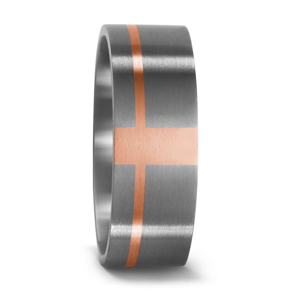 Bague en titane avec détails en or rouge 750. Design moderne et élégant, alliant la robustesse du titane à la chaleur de l'or rouge. Parfaite pour un style contemporain et raffiné. Confortable à porter, cette bague est un choix idéal pour une touche unique et sophistiquée.