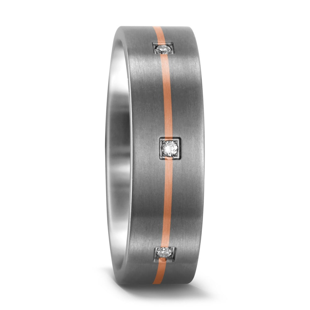 Bague pour femme en titane avec une élégante incrustation en or rouge 750, ornée de trois diamants étincelants. Design moderne et raffiné, combinant robustesse du titane et luxe des matériaux précieux, idéale pour un style unique et sophistiqué au quotidien.