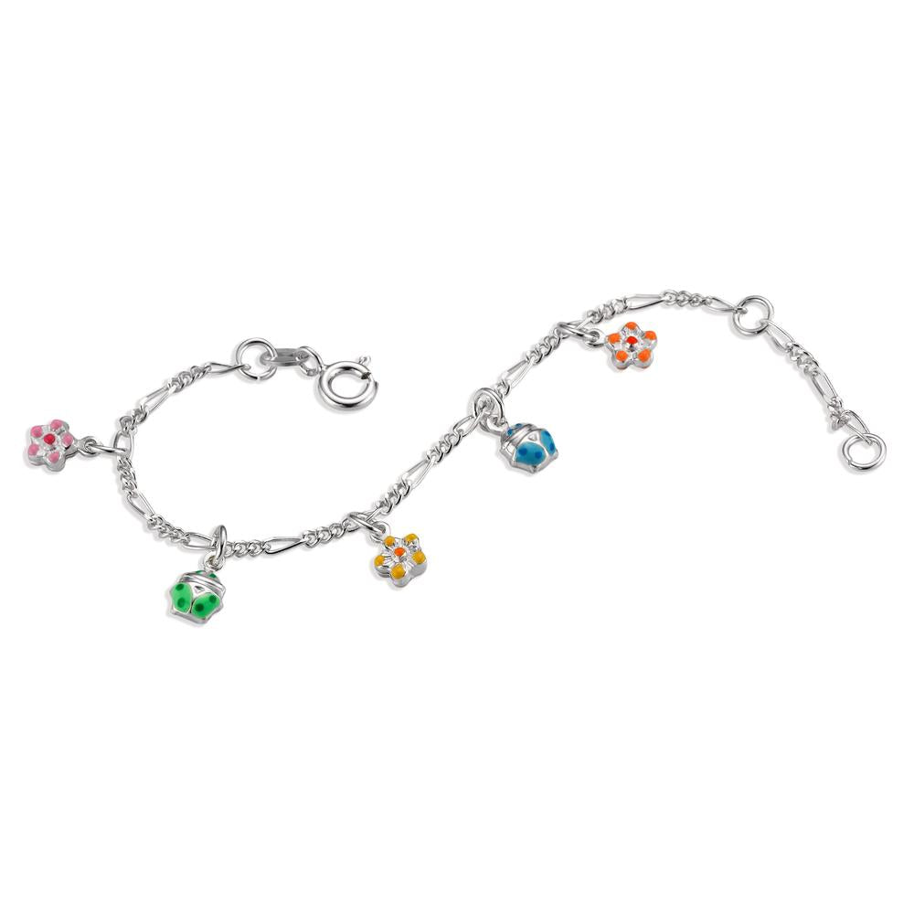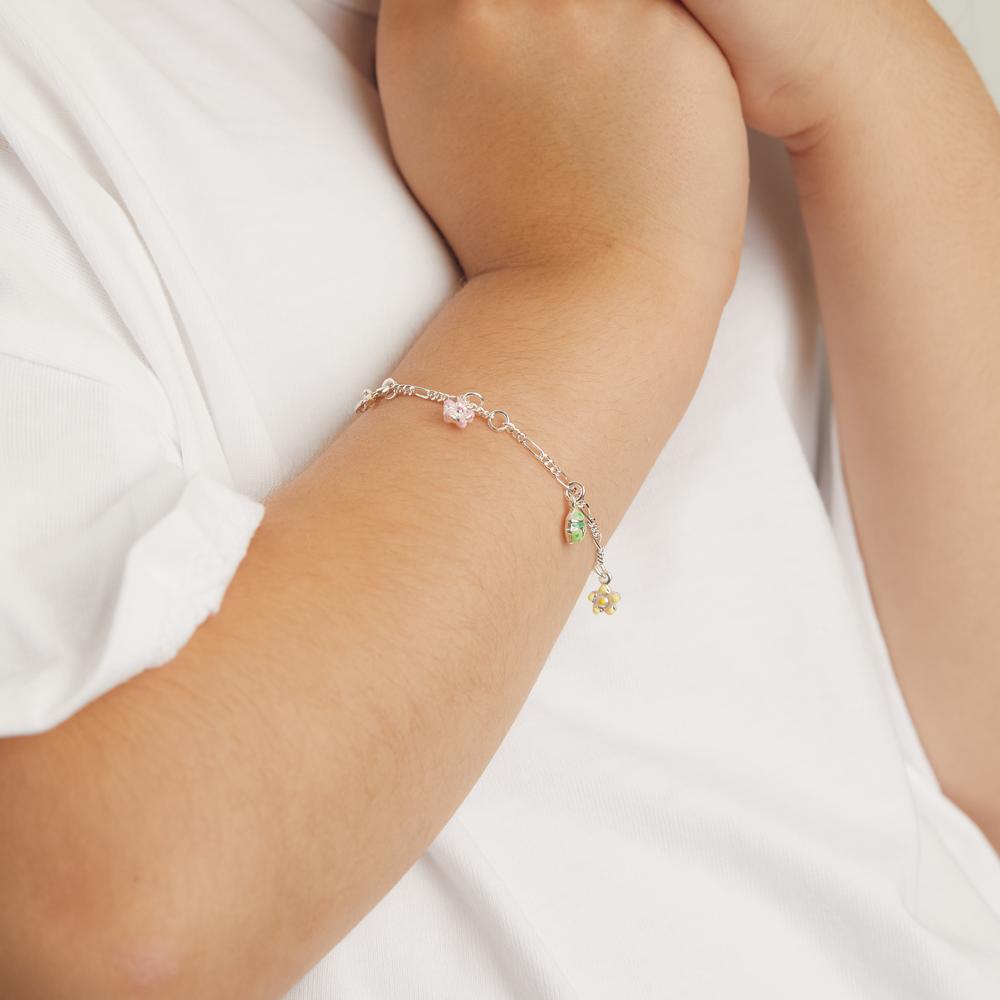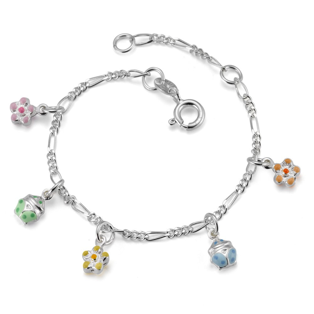 Bracelet pour fille en argent avec de jolis pendentifs en forme de fleur et coccinelle colorés. Ce bijou délicat et charmant est parfait pour apporter une touche de gaieté et d'élégance au poignet des petites filles. Fermoir sécurisé facile à utiliser.
