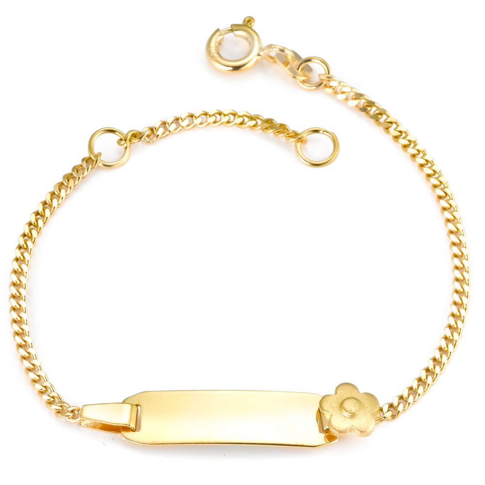 Bracelet gravé pour bébé en or jaune 750. Élégant et délicat, ce bracelet est parfait pour un cadeau personnalisé, avec une petite plaque gravable et un charm en forme de fleur. Un bijou précieux, sûr et raffiné pour les tout-petits.