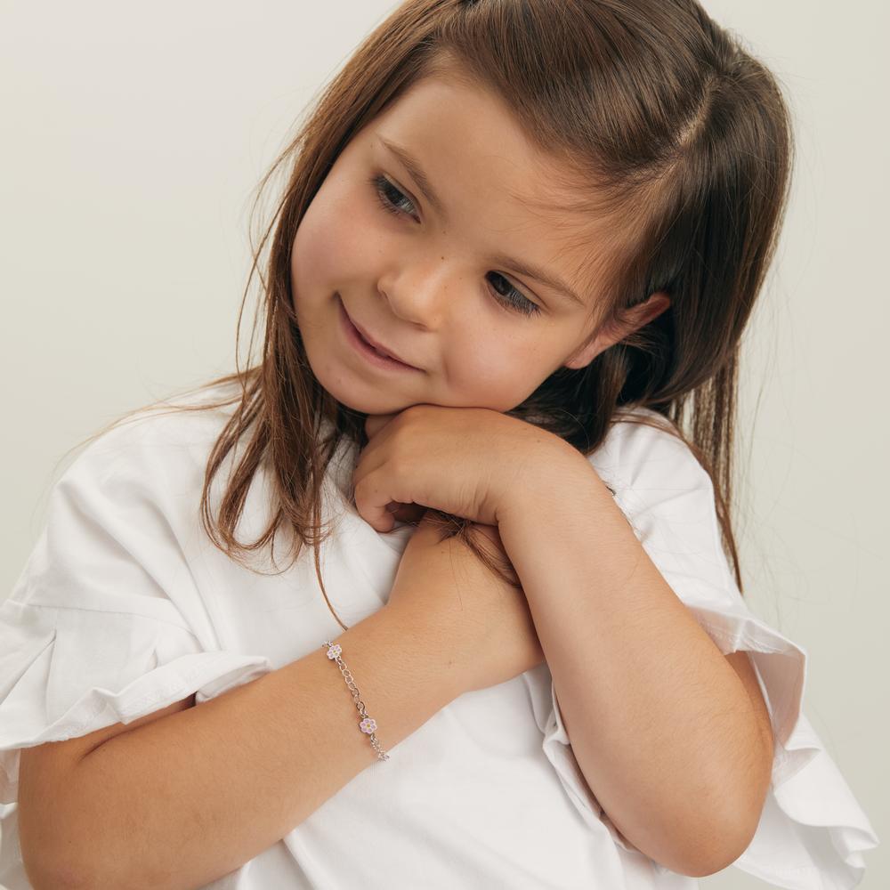 Bracelet en argent pour fille, délicatement orné de petites fleurs roses avec un cœur jaune. Ce bijou charmant et léger apporte une touche de fraîcheur et de gaieté au poignet des plus jeunes. Parfait pour offrir ou pour compléter une tenue enfantine avec élégance.