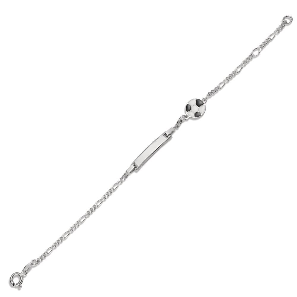 Bracelet d'identité enfant argent rhodié. Maille figaro 3/1 avec ballon de foot. Fermoir anneau à ressort. Long. 16 cm, anneau intermédiaire à 14 cm.