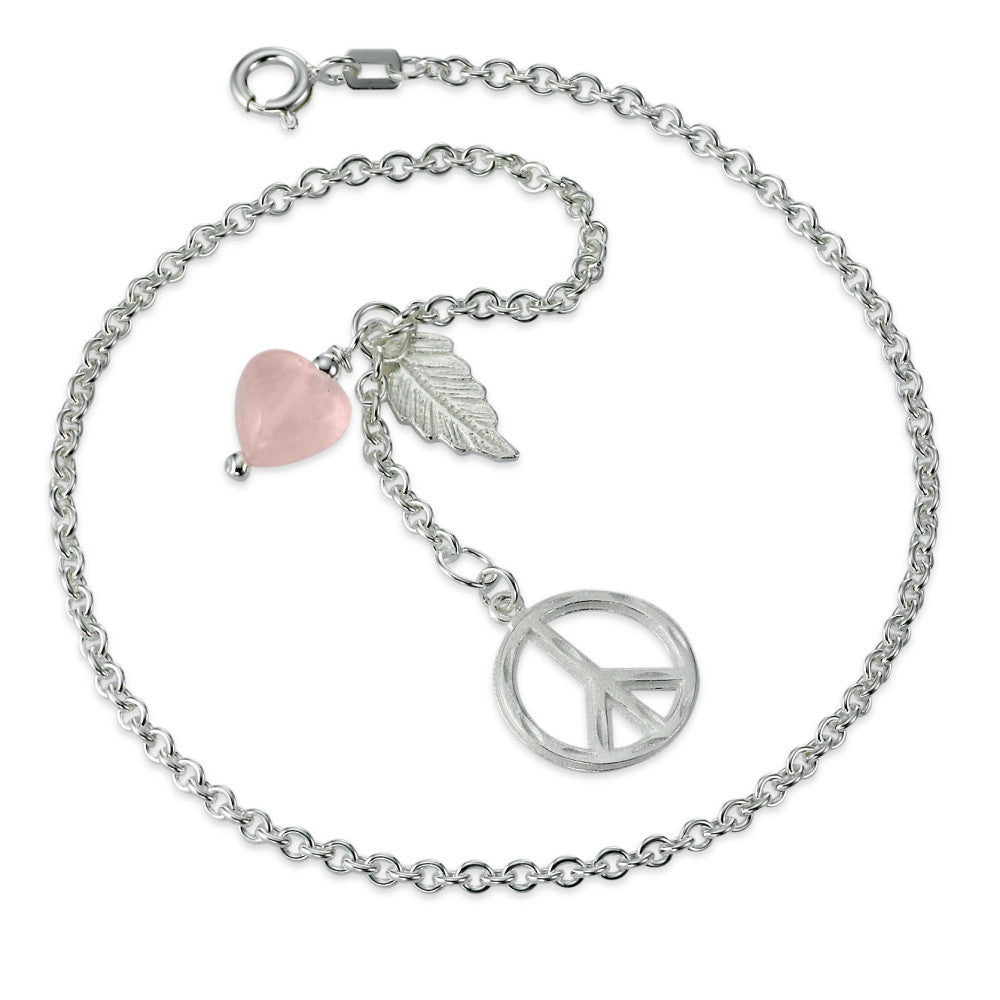Jolie chaîne de cheville pour femmes en argent, ornée d'un pendentif cœur en quartz rose et de breloques feuille et peace. Élégante et délicate, cette chaîne apporte une touche de douceur et de symbole à vos tenues estivales et décontractées.
