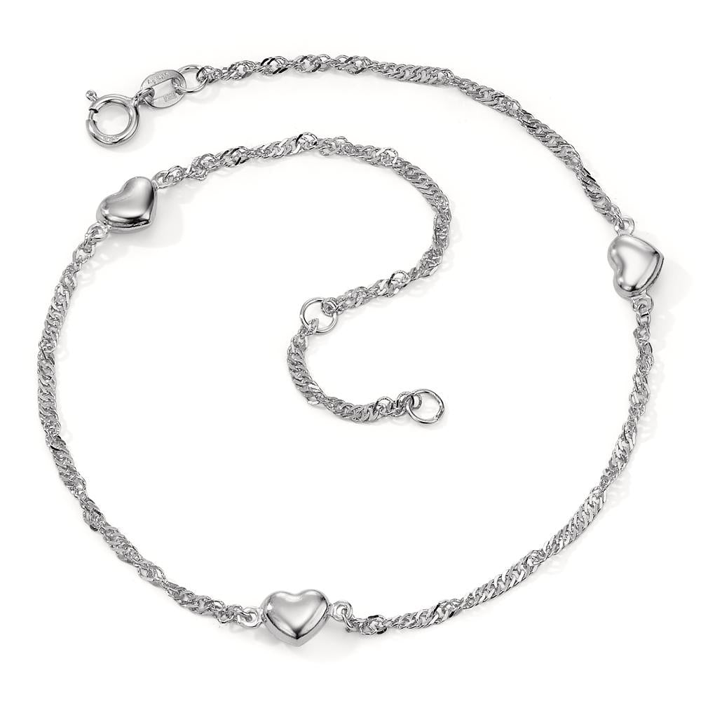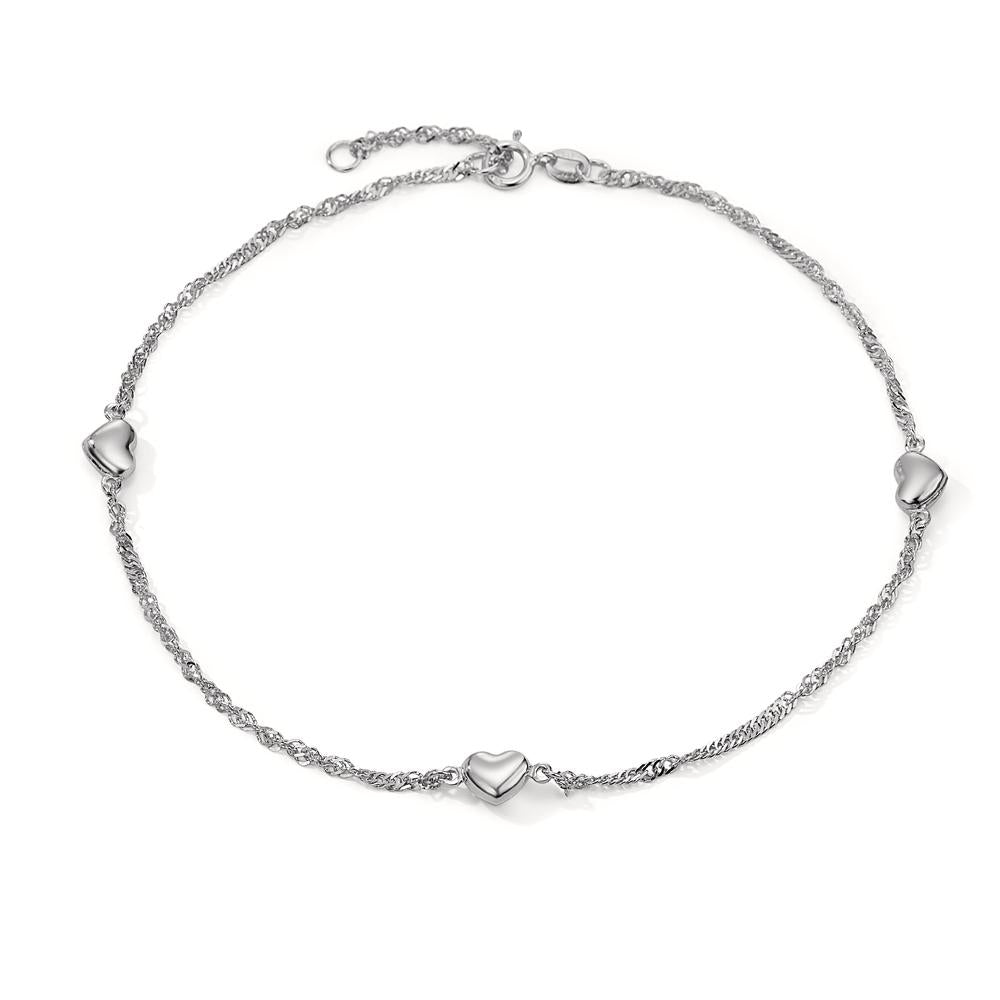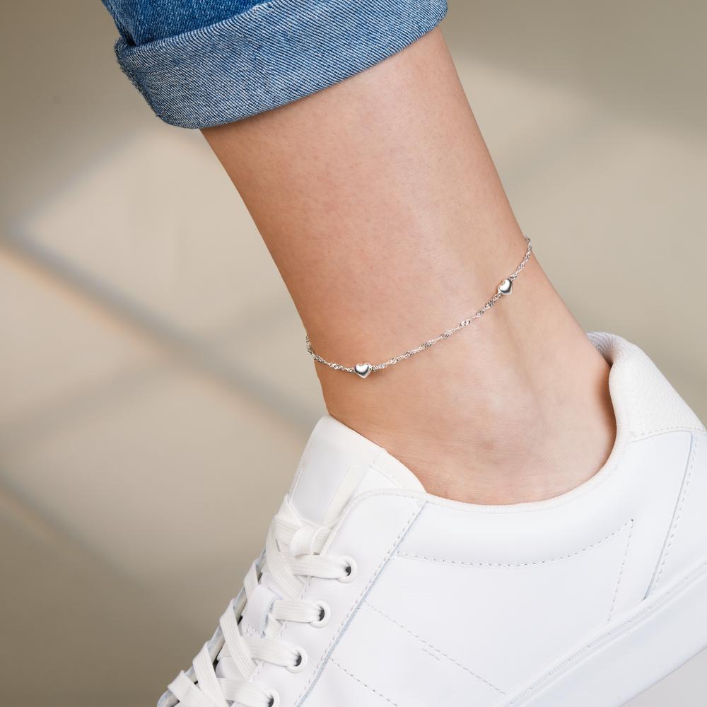 Chaîne de cheville femme en argent avec trois cœurs élégants. Un bijou délicat et raffiné, parfait pour sublimer vos pieds avec une touche romantique. Idéal pour un look estival ou un cadeau plein de tendresse. Ajustable et confortable à porter.