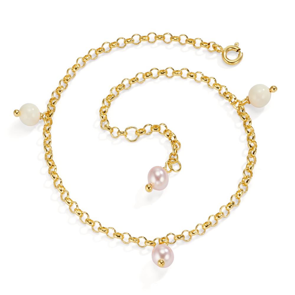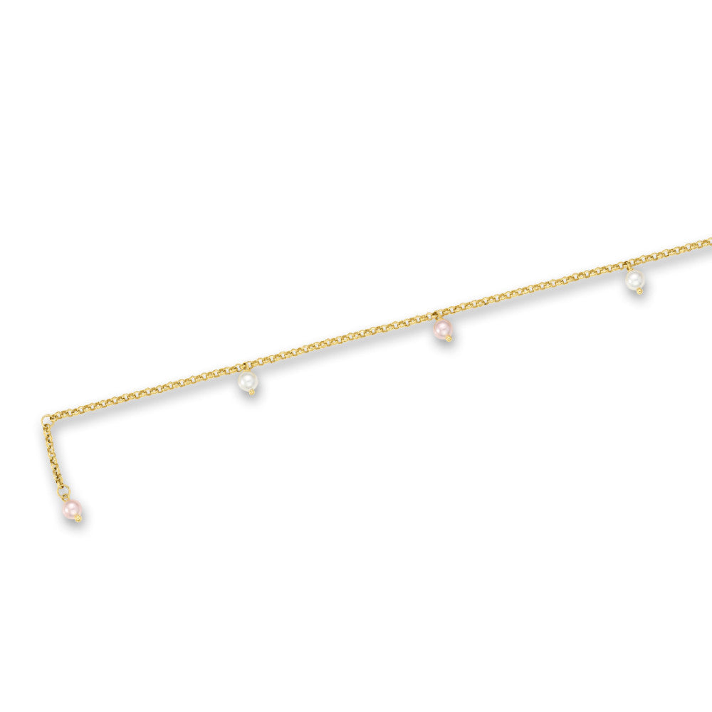 Bracelet de cheville pour femme en bronze doré, orné de perles brillantes rose et blanches. Élégant et raffiné, ce bijou léger ajoute une touche lumineuse et délicate à votre style estival. Parfait pour sublimer vos tenues décontractées ou habillées.