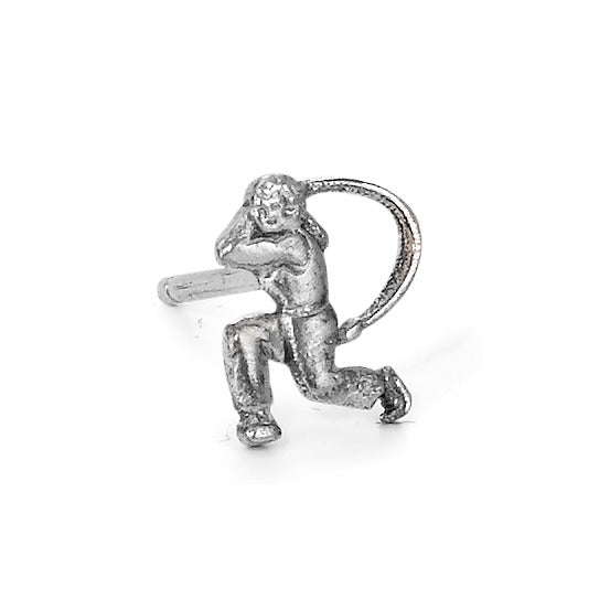 Boucle d'oreille homme en argent représentant un joueur de Hornussen en action. Ce clou d'oreille unique allie originalité et passion pour ce sport traditionnel suisse. Un accessoire discret et stylé, parfait pour les amateurs de Hornussen souhaitant afficher leur passion au quotidien.