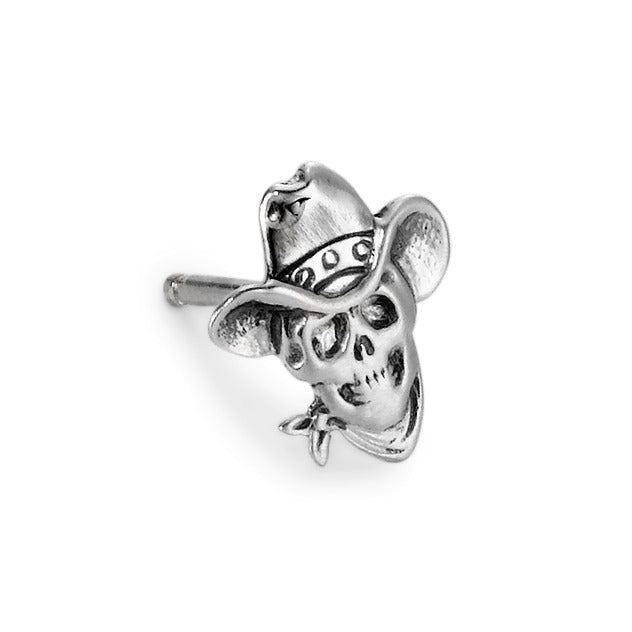 Clou d'oreille pour homme en argent, design tête de mort style Far West. Un accessoire unique qui allie audace et caractère pour un look rebelle et tendance. Parfait pour affirmer votre style avec originalité et élégance. Vente à l'unité.