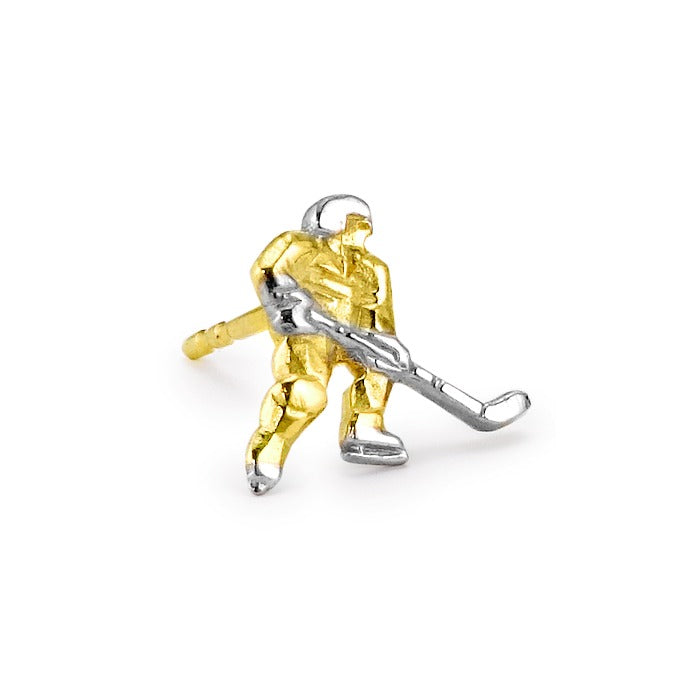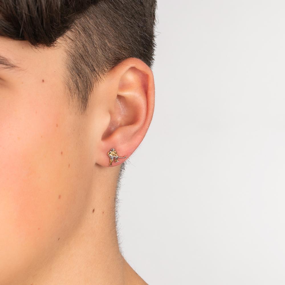 Clou d'oreille homme en or jaune 375, représentant un joueur de hockey sur glace. Un bijou unique et élégant pour les passionnés de sport, combinant finesse et originalité. Parfait pour affirmer votre style avec une touche sportive.
