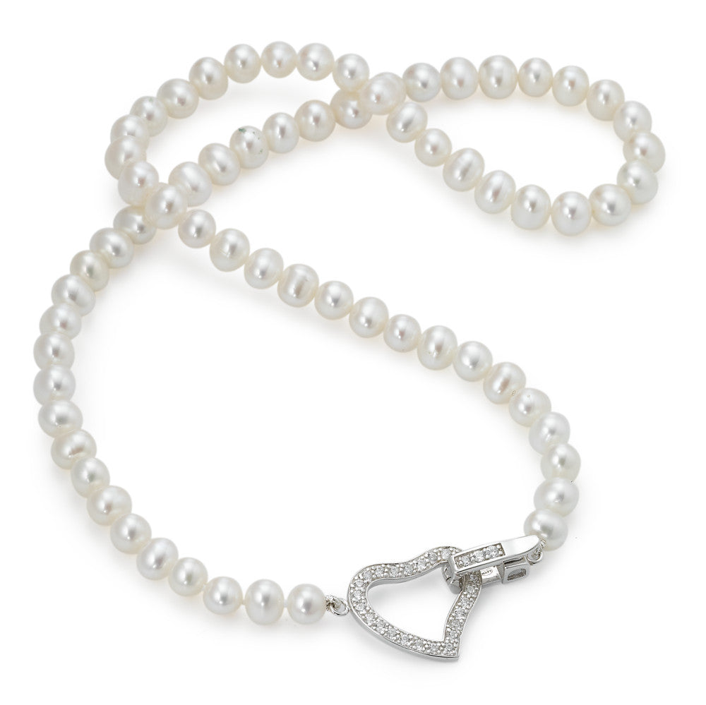 Collier pour femme en argent avec perles de culture d’eau douce et fermoir en forme de cœur orné de zircones scintillantes. Élégant et raffiné, ce bijou sublime toutes vos tenues avec une touche de douceur et d’éclat naturel. Idéal pour toute occasion.