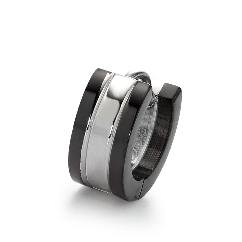 Boucle d'oreille homme en acier inoxydable, 1 pièce. Design robuste avec un fini bicolore noir et argenté, parfait pour un look moderne et élégant. Facile à enfiler grâce à son système pliable. Un accessoire essentiel pour un style masculin affirmé.