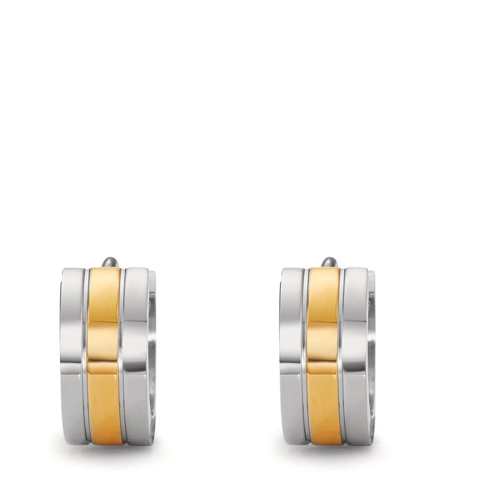 Boucles d'oreilles créoles pour femmes en acier inoxydable. Design bicolore élégant combinant finition argentée et dorée pour un style moderne et raffiné. Fermoir à clip sécurisé, idéal pour un port quotidien confortable et durable. Parfait pour sublimer toutes vos tenues.