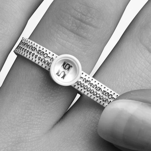Déterminez facilement et précisément la taille de votre annulaire grâce à notre Multisizer, jauge de taille d'anneau. Le multisizer fonctionne comme une ceinture. Enfilez l'extrémité de la ceinture dans la fente pour former un anneau. Placez le multisizer sur votre doigt et tirez fermement jusqu'à ce qu'il soit confortable. Il doit facilement glisser sur les doigts. Lisez la taille de la bague affichée sur la languette lorsque le Multisizer est confortable.