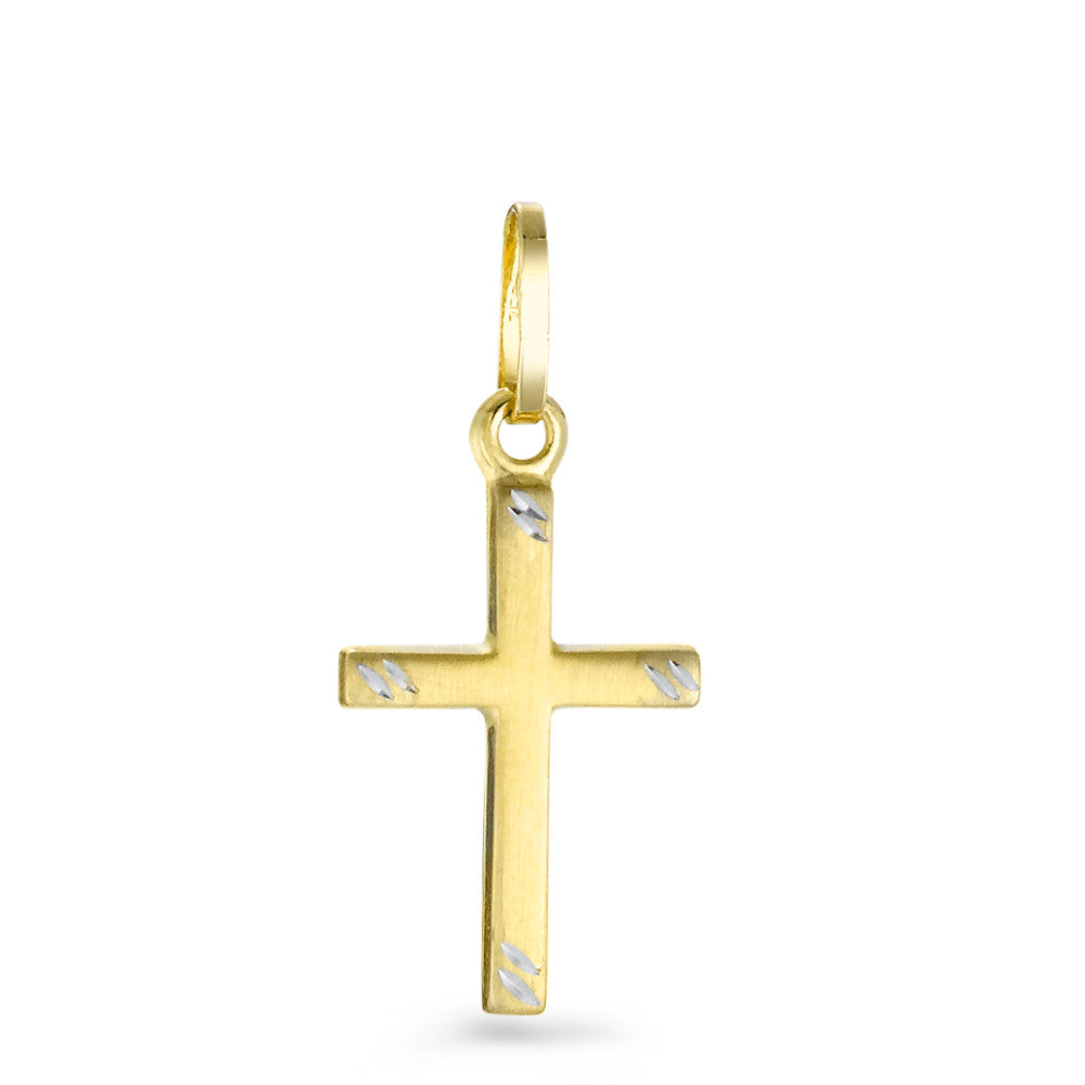 Pendentif croix en or jaune 18 carats (750), au design classique avec finitions polies et détails subtils en or blanc. Un bijou élégant et intemporel, parfait pour porter un symbole de foi au quotidien ou offrir un cadeau chargé de signification.