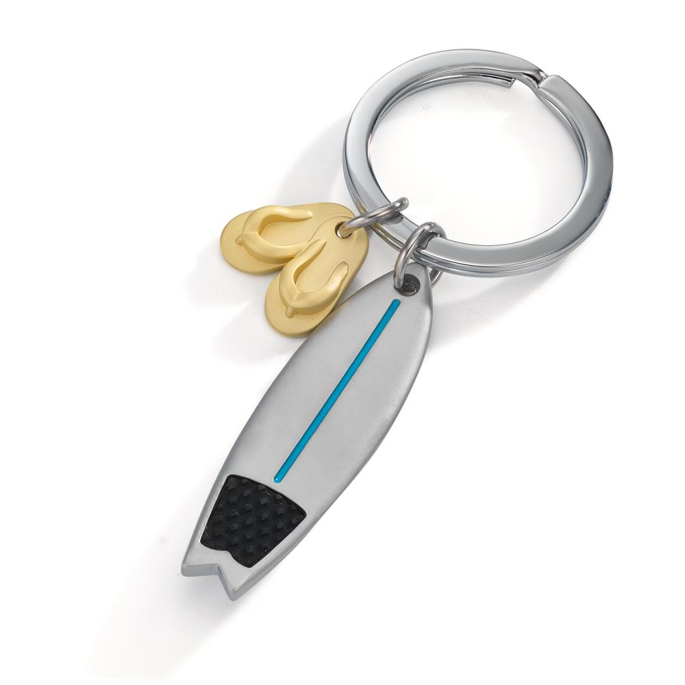 Porte-clés en métal au design estival, avec breloques en forme de planche de surf et tongs dorées. Idéal pour les amateurs de plage et de surf, ce porte-clés robuste et élégant ajoute une touche de fun et de style à vos clés. Parfait cadeau pour l’été !